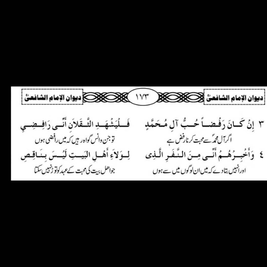 يا آلَ بَيتِ رَسولِ اللَهِ حُبَّكُمُ. فَرضٌ مِنَ اللَهِ في القُرآنِ أَنزَلَهُ. يَكفيكُمُ مِن عَظيمِ الفَخرِ أَنَّكُمُ. مَن لَم يُصَلِّ عَلَيكُم لا صَلاةَ لَهُ. . .