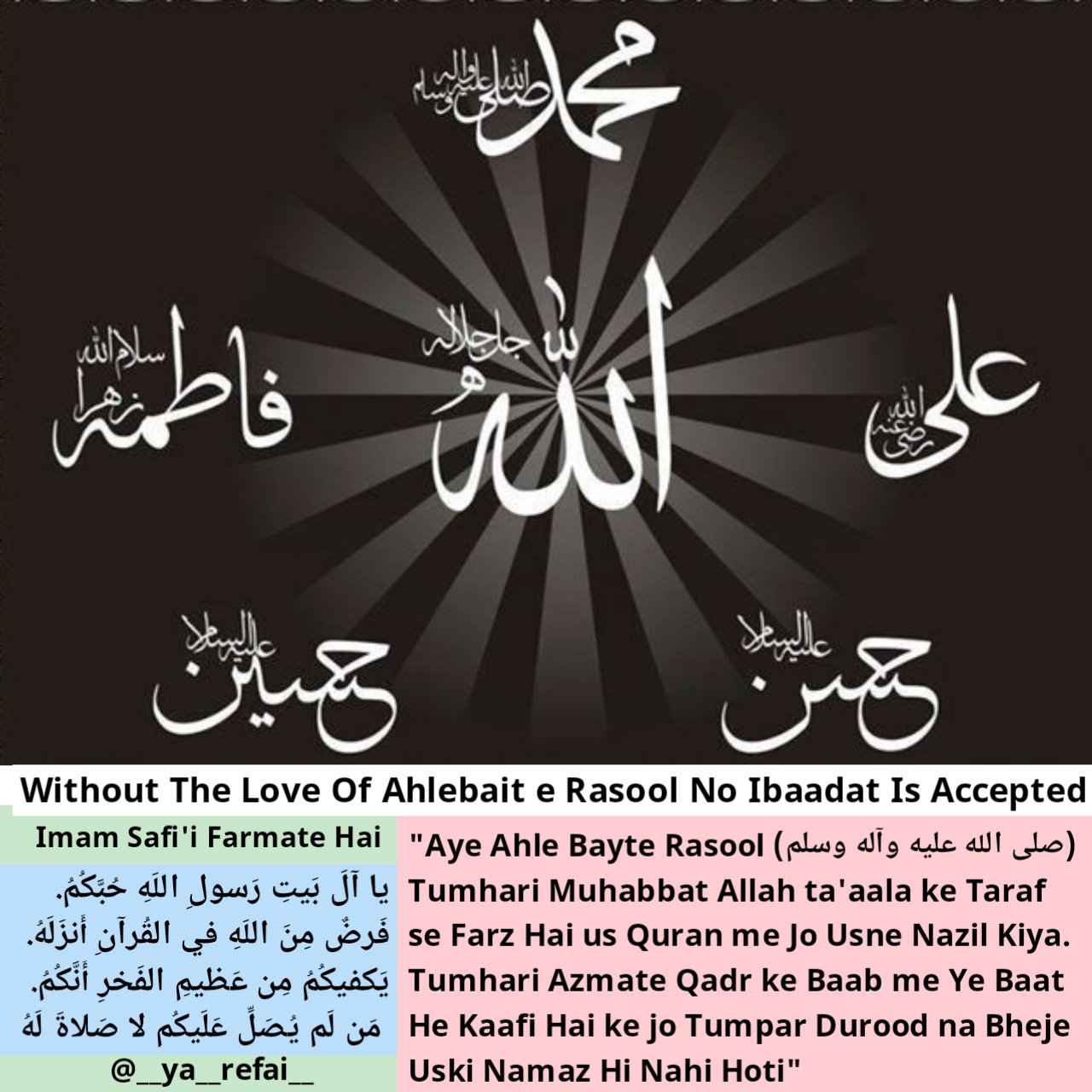 “Aye Ahle Bayte Rasool (SallAllahu Alaihi wa Aalihi wa Sallam) Tumhari Muhabbat Allah ta’aala ke Taraf se Farz hai us Quran me Jo Usne Nazil kiya.