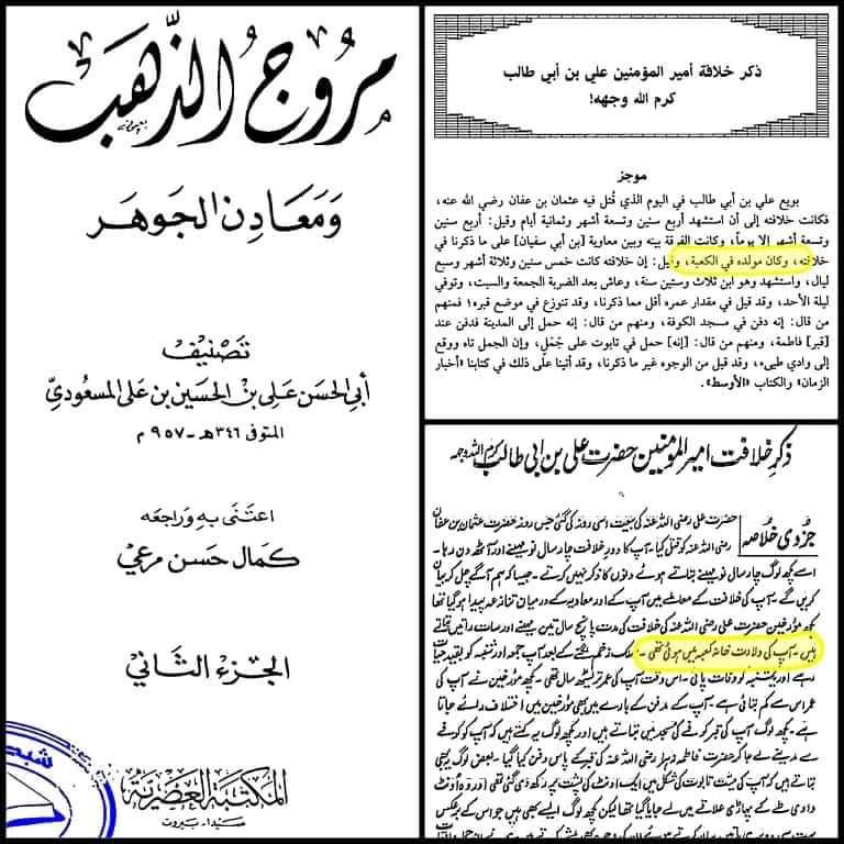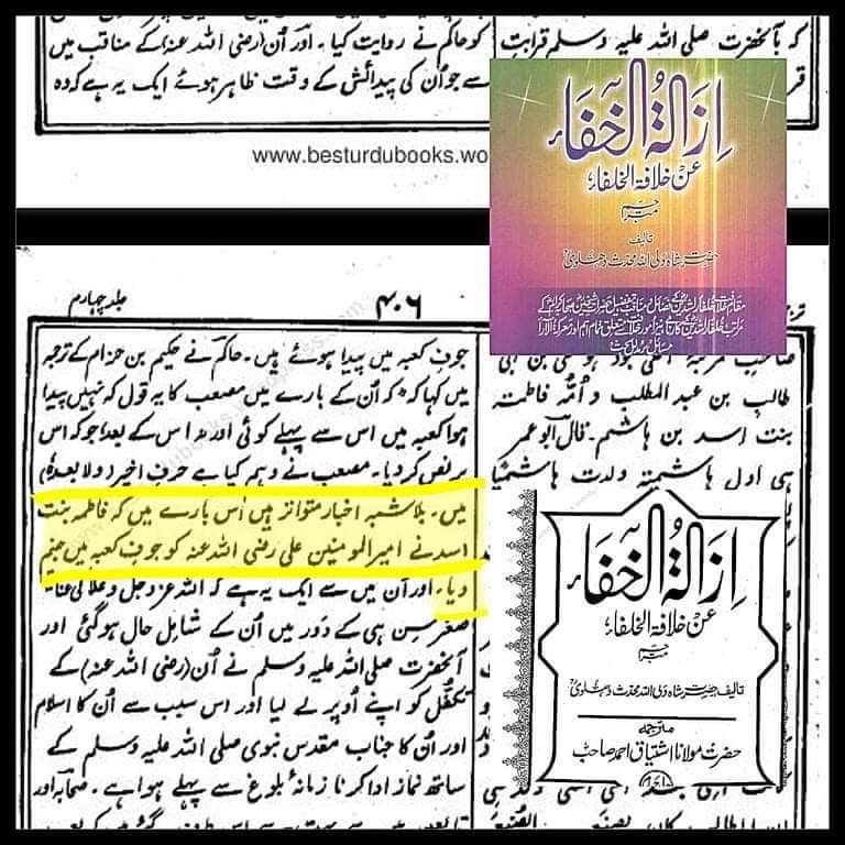 “امیر المومنین حضرت علی بن ابی طالب کرم اللہ وجہ خانہ کعبہ میں فاطمہ بنت اسد کے بطن مبارک سے پیدا ہوئے یہ روایت تواتر کی حد تک ہے۔” ( مستدرک حاکم نیشاپوری، ج3 ص483 و کفایۃ الطالب،ص260)