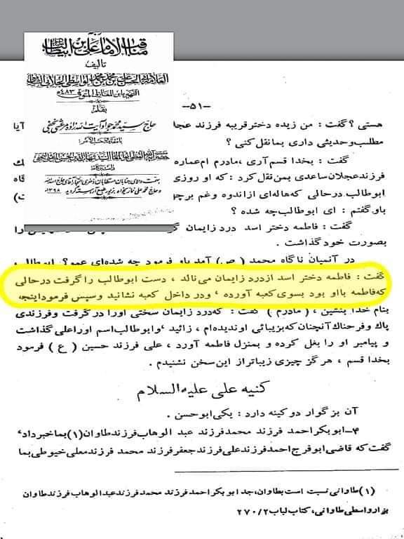 ” وَقَد تَوَاتِرَتِ الاَخبٰارُ اَنَّ فَاطِمَۃَ بِنتِ اَسَد وَلَدَت اَمِیرَ المُومِنِینَ عَلِی ابنُ اَبِی طَالِبٍ کَرَّمَ اللّٰہُ وَجہَہُ فِی جَو فِ الکَعبَۃ “