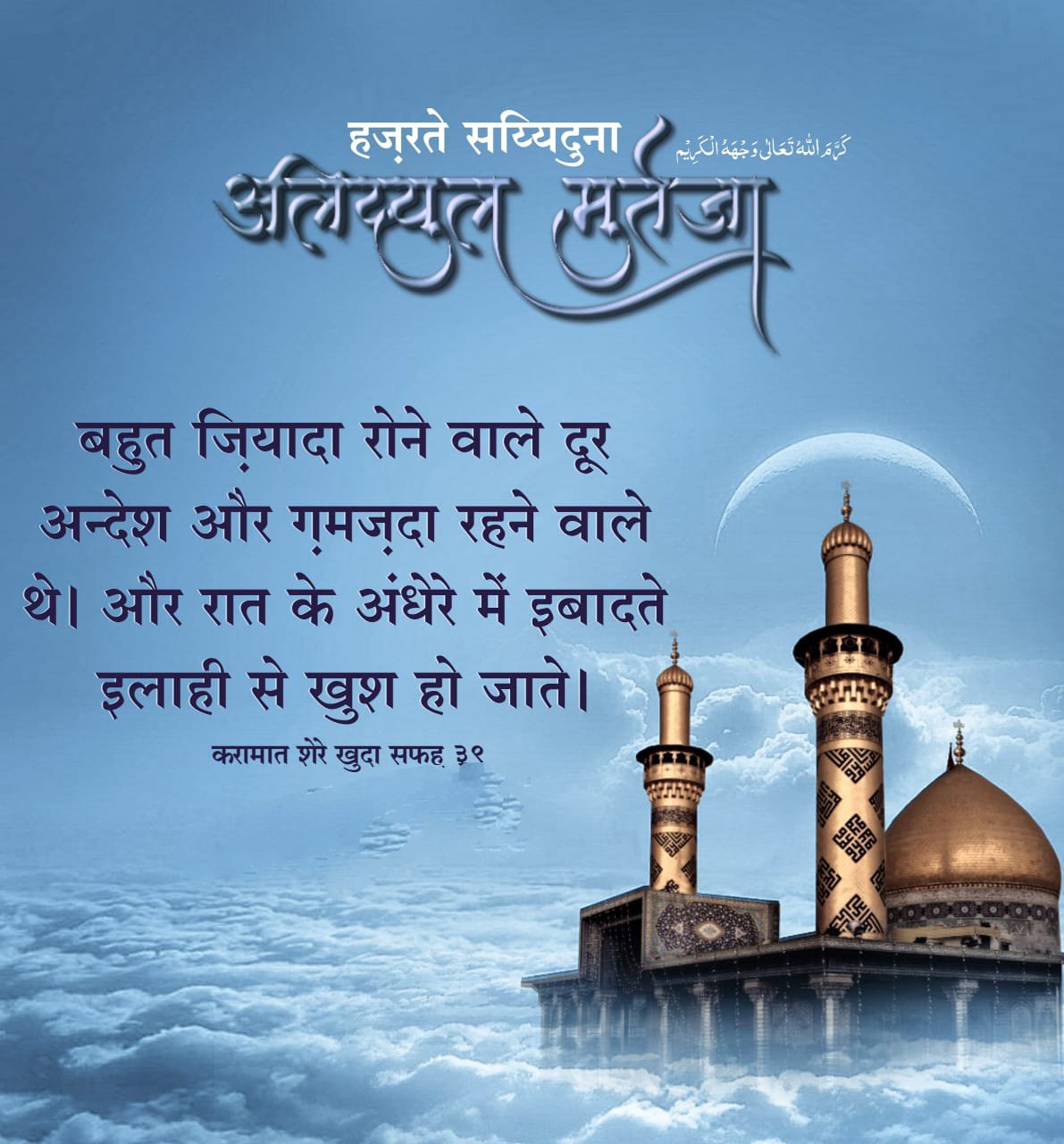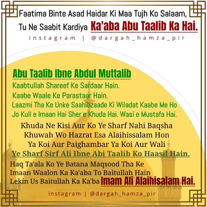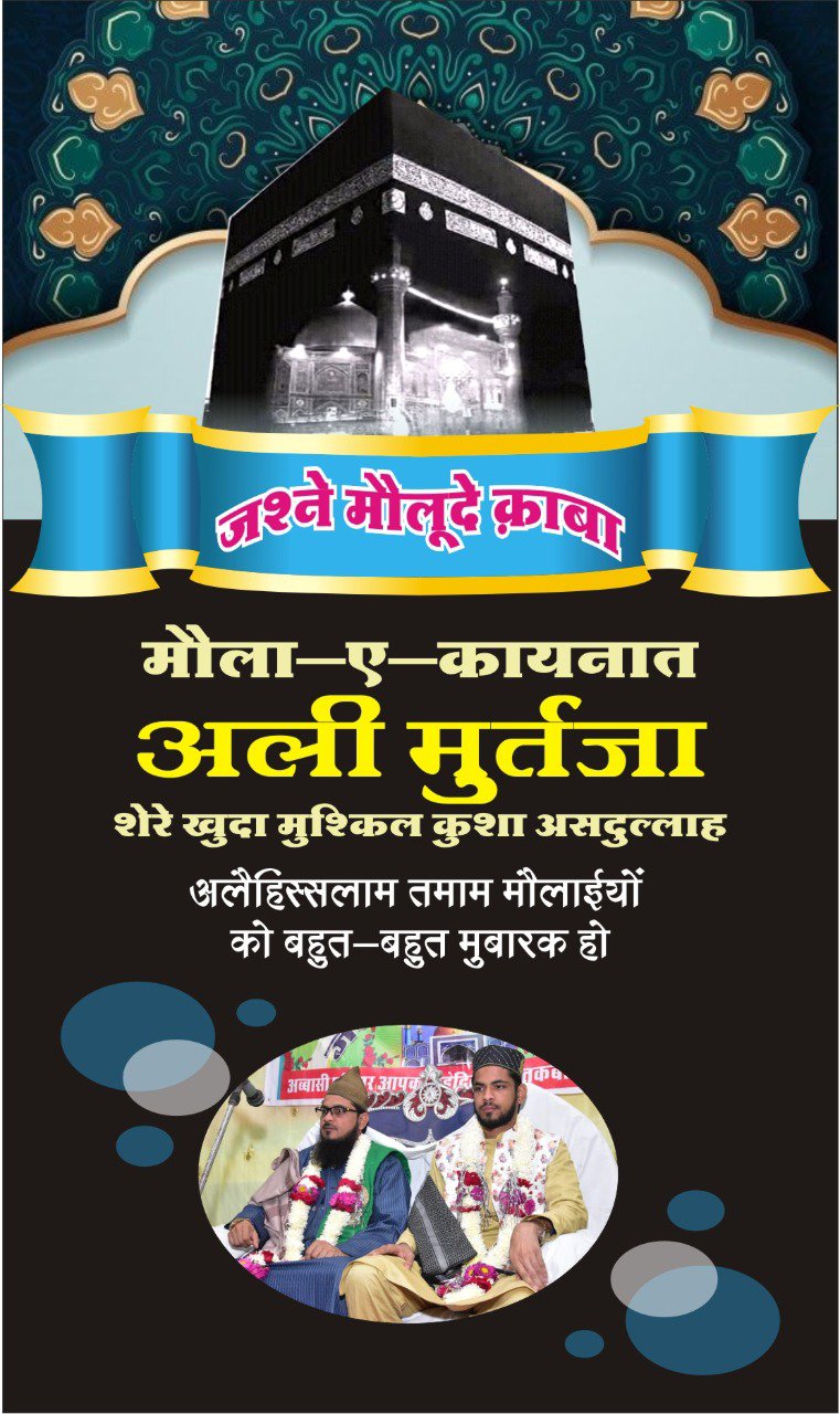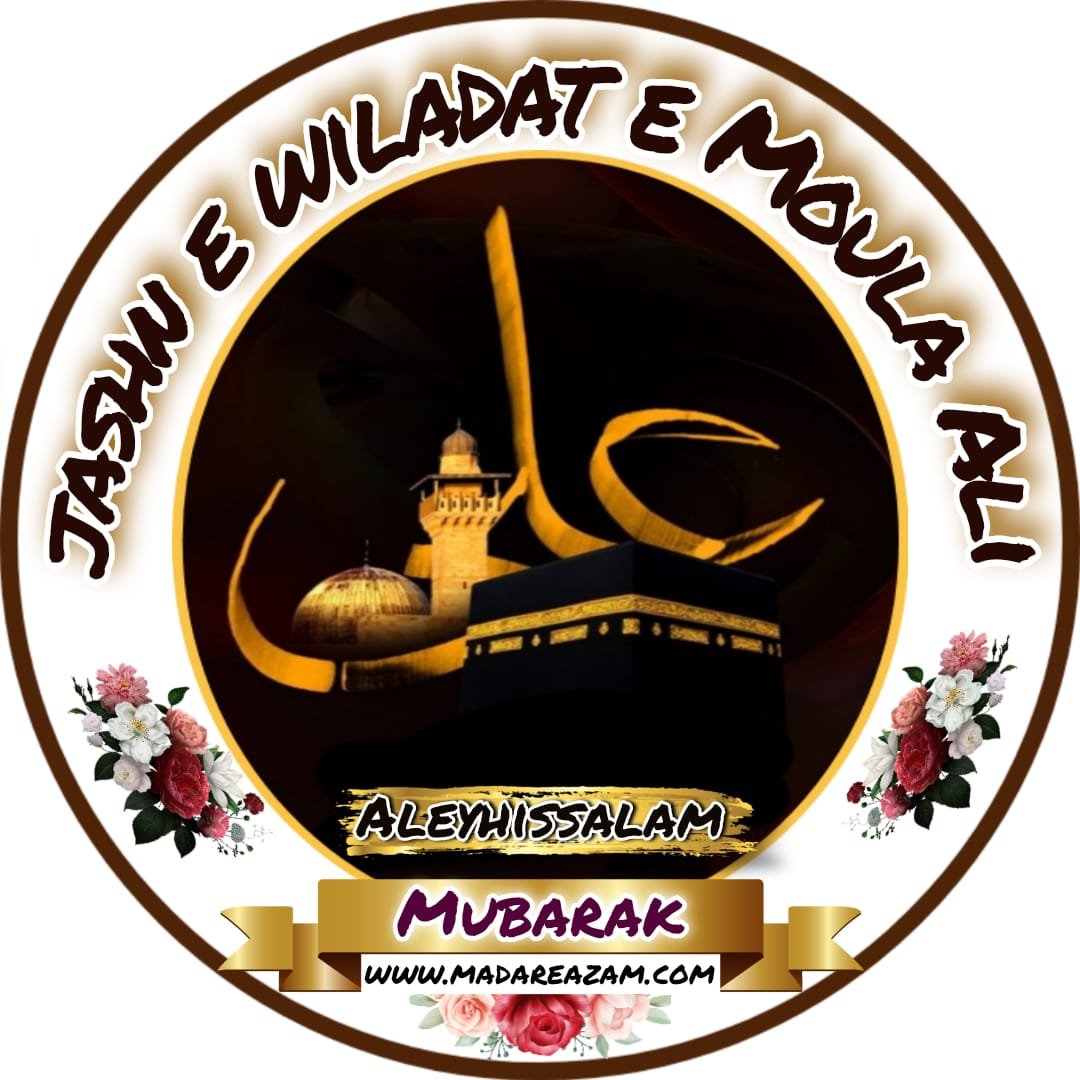 *Wasi e Rasool ﷺ Nafs e Rasool ﷺ Biradar e Rasool ﷺ Janasheen e Rasool ﷺ Damad e Rasool ﷺ Haider e Karrar Sher e Khuda Sher e Yazda Moloud e Kabah Imaam ul Aulia Imam ul Muttaqin Syed ul Asfiya Taj ul Aarifeen Ameer ul Momineen Khalifat ul Muslimeen Abu Turab Mola e Kaynat Huzoor Syedna Mola Imaam Ali (Alahis Salam) Ibne Hazrat Syedna Imran Abu Talib (Alaihis Salam)*
