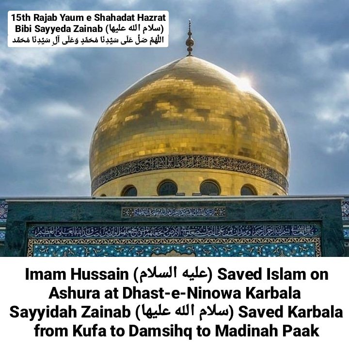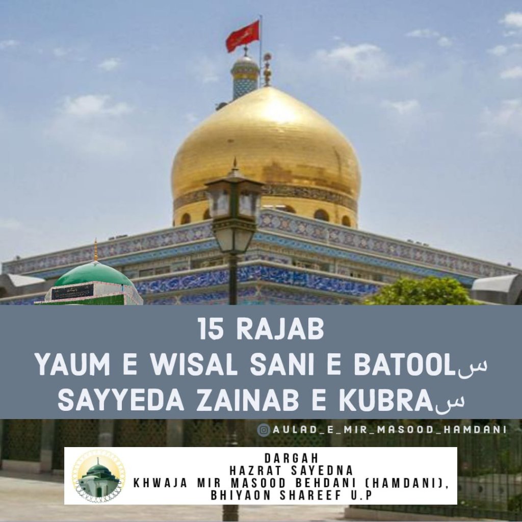 Aapki Wiladat 1 Shaban ul Muazzam 5 Hijri Mutabik 3 August 626 Esvi Madina Pak Saudia Arabia Me Hui, Aapka Wisaal 15 Rajab ul Murajjab 62 Hijri Mutabik 682 Esvi Me Hua, Aap Imaam ul Ambiya Huzoor Ahmad e Mujtuba Muhammad Mustufa (Sallallahu Alaihi wa Aala Aalehi wa Sallam) Ki Nawasi Mola e Kaynat Mola Imaam Ali (Alaihis Salam) Aur Syyeda e Kaynat Syyeda Fatima Zehra (Salamun Aleha) Ki Sahabzadi Ameer ul Momineen Mola Imaam Hasan Mujtuba (Alaihis Salam) Aur Imaam e Aali Maqam Mola Imaam Hussain (Alaihis Salam) Ki Behan Hain, Jab Aapki Umar 3-4 Saal Ki Thi To Huzoor (Alaihis Salam) Ne Wo Andaaz Apna Liya Jisme Huzoor (Alaihis Salam) Aaj Zinda Hain, Us Waqt Aapne Apna Sar Mubarak Huzoor (Alaihis Salam) Ke Sine Mubarak Pe Rakha Tha Aur Udaas Khadi Thi, 6 Mahine Ke Baad Aapki Walida Majida Syyeda Fatima Zehra (Salamun Aleha) Ne Parda Farma Liya, Jab Badi Hui To Walid e Mohtarm Mola Imaam Ali (Alaihis Salam) Shaheed Kar Diye Gaye, Kuch Saalo Ke Bad Aapke Bade Bhai Mola Imaam Hasan Mujtuba (Alaihis Salam) Ki Bhi Shahadat Ho Gayi, Ye 4 Waaqiyat Ke Waqt Puri Duniya Maujood Thi Sabne Dekha Lekin Karbala Me Jab Sare Shaheed Ho Gye Mola Imaam Hussain (Alaihis Salam) Ki Shahadat Ke Bad Ahle Baith e Paak Me Sabse Senior Syyeda Zainab (Salamun Aleha) Thi, Karbala Me Aapke Do Sahabzade Hazrat Syedna Aun bin Abdullah Aur Hazrat Syedna Muhammad Bin Abdullah Bhi Shaheed Ho Gye, Karbala Tak Jo Hua Wo Bhut Dardnaak Tha Lekin Iske Aage Jo Kuch Hua Wo Bhi Dil Dehla Dene Wala Hai Lute Hue Kafile Ko Syyeda Zainab Apni Nigrani Me Damishq Se Hote Hue Madina Pak Le Aayi, Damishq Aur Raste Me Aese Khutbe Bhi Diye Jisse Aesa Lagta Tha Ke Khud Mola Ali Khitab Farma Rahe Ho, Jab Madina Pak Aayi To Har Koi Unse Karbala Ke Waqiyaat Janne Ke Liye Aata Tha, Kuch Mahino Ke Bad Aap Apne Shohar Hazrat Abdullah Ibne Jafar (Razi Allahu Tala Anhu) Ke Sath Damishq Chali Gayi Aur Ak Saal Bad Aapka Wisaal Ho Gaya, Itne Gum Sehne Ke Baaes Aapki Kunniyat Ummul Masaib Hui Yaani Bhut Zada Gum Bardasht Karne Wali, Aapka Mazar Mubarak Damascus, Syria Me Marjai Khaliak Hain…