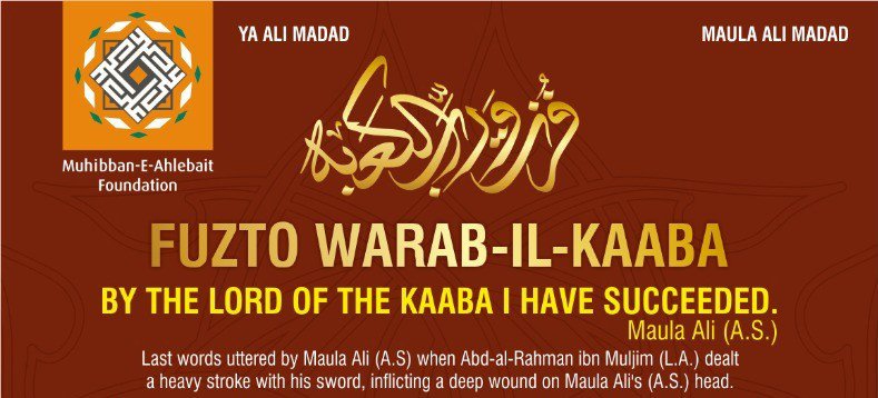 Maula ne farmaya Beti Ummul kulsum tumne apne baba ko bhula diya kya kabhi mere dastar khwan ne ek chiz se jyda chiz rahi hai. Phir umme kulsum ne chaha ke namak utha le lekin maula ne mana kr diya aur kaha ki doodh utha lo yaha kufe me yateem bohot hai unke paas peene ke liye doodh nhi hai, Phir maula ne namak aur jaw ki roti ke sath iftar kiya, Phir maula jab Bibi Umme kulsum ke ghar se bahar nikle toh Ghar ke bahar batakh(Duck) rasta rokne lage maula ke samne zor zor se awaaz nikalne lage Bibi Umme kulsum ne pucha baba yeh kya kr rhe hai toh Maula ne kaha ki yeh Noha kr rhe hai , Phir maula masjid e kufa me pohche aur soye hue logo ko uthaya aur waha pr Ibn Muljim bhi tha maula ne use bhi awaaz di Aur uthaya phir maula ne imamat ki namaz ki aur jab maula ne sajda kiya phir us lanati Ibn e Muljim ne talwar nikala aur maula ke sar par zarb laga di jo usne 1000 dirham me kharidi thi aur zeher me duba kr rakha hua tha ,Phir maula ne Sukr Adaa krte hue kaha “Fuztu Bi Rabbil Kaaba” (Rab e Kaaba ki Kasam me Kamyab ho gaya) Phir huqum Diya imam Hasan ko namaz muqammal krne ki Imam Hasan ne Namaz muqammal krwayi Phir Imam Hasan,Imam Hussain aur Hazrat Muhammad e hanafiya ne sambhala aur phir Ghar le gaye, logo ne Ibn Muljim ko pakad liya tha aur Maula ke pass pesh kiya use phir Maula Ali ne Hazrat e Abbas ko kaha Bete Abbas ise Sharbat pilao yeh khabraya hua hai aur phir farmaya jo tum khate ho ise khilao aur Jo tum peete ho ise pilao….