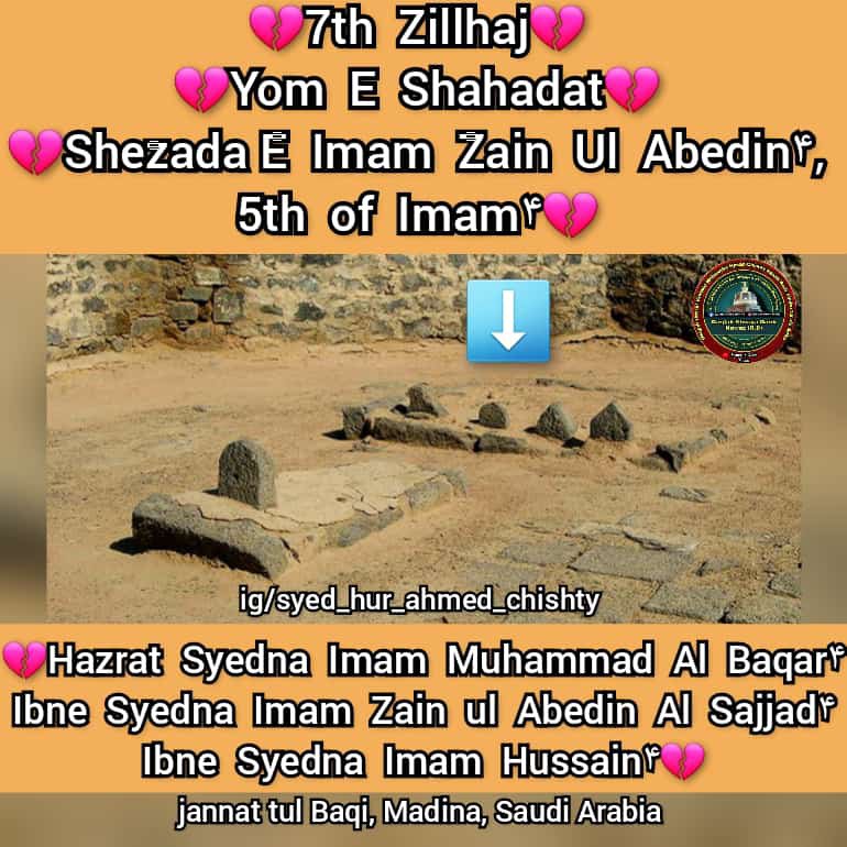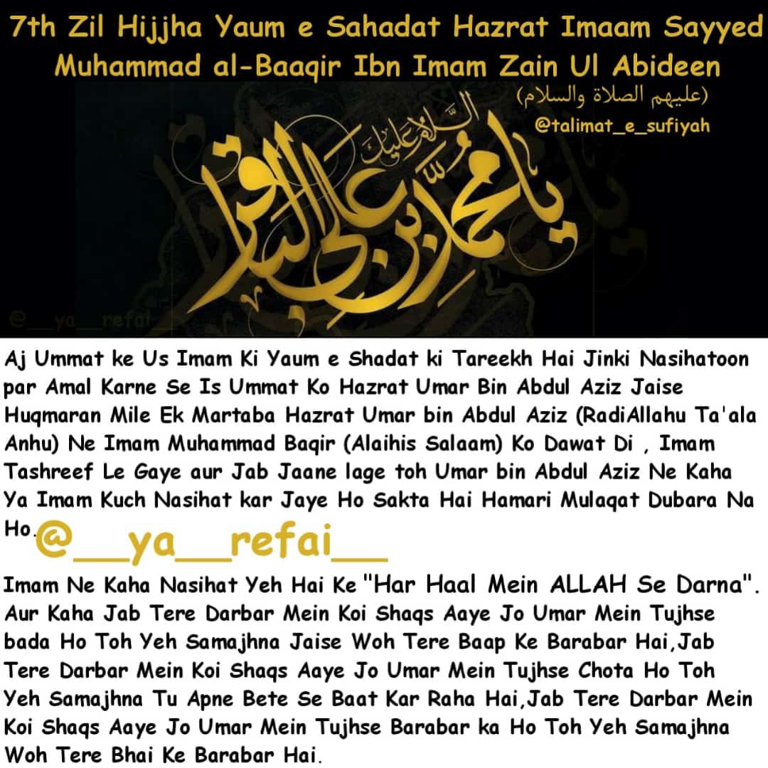 Aapki Wiladat 1 Rajab ul Murajjab 57 Hijri Mutabik 676 Esvi Ko Madina Paak Me Hui, Aapki Shahadat 7 Zil Hajj 114 Hijri Mutabik 28 January 733 Esvi Ko Hui, Aap Mola e Kaynat Hazrat Syedna Mola Imaam (Ali Alaihis Salam) Ke Parpote Imaam e Aalimaqaam Hazrat Syedna Mola Imaam Hussain (Alaihis Salam) Ke Pote Aur Sayyed us Sajideen Hazrat Syedna Mola Imaam Ali Al Zainul Aabedin (Alahis Salam) Ke Shahzade Aur Tajdar e Imamat wa Wilayat Hazrat Syedna Mola Imaam Jafar Sadiq (Alaihis Salam) Ke Walid e Majid Hain, Aap Aaimma e Ahle Baith e Pak Ke 5we Imaam Hain, Imaam e Aazam Abu Hanifa Hazrat Noman Bin Sabit (Razi Allahu Tala Anhu) Bhi Apke Shagird Hain, Aapka Mazar Mubarak Jannatul Baqi Sharif, Madina Pak, Saudia Arabia Me Marjai Khaliak Hain…