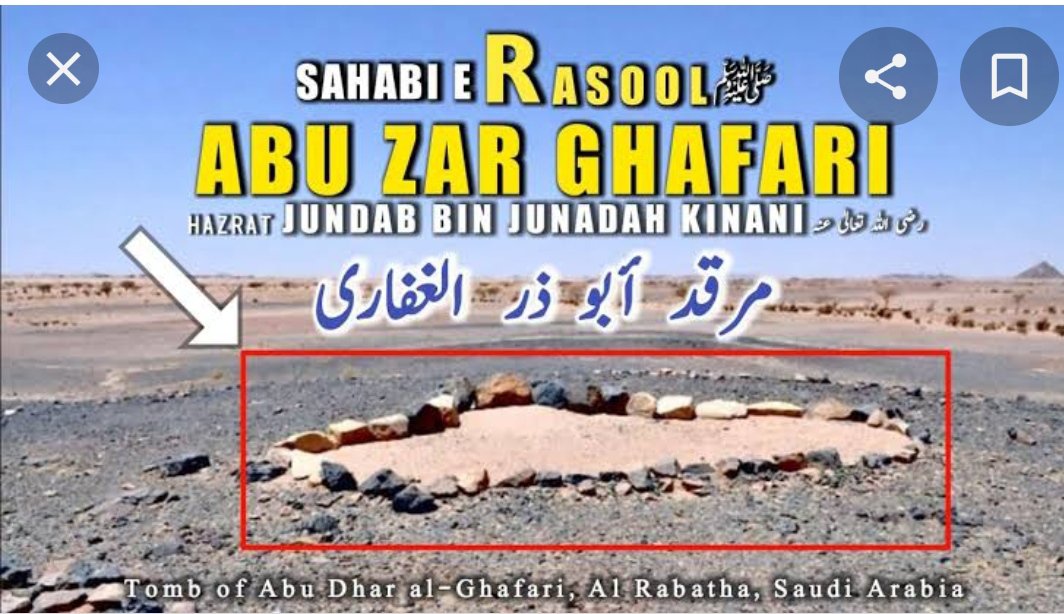 Hazrat Abu Zar Ghaffari (Radhiallahu Anhu) is reported to be the fourth Muslim in chronological order. He had the exclusive honour to call the Prophet Muhammad (saw) as Ya Habibi (my dear friend), while everybody else could only address him as Ya Rasool Allah. Abu Zar finally arrived in Madina after the Battle of Ahzab / Battle of the Trench (5th year of Hijra) and spent the rest of the days in the company of the Prophet Muhammad (saw).