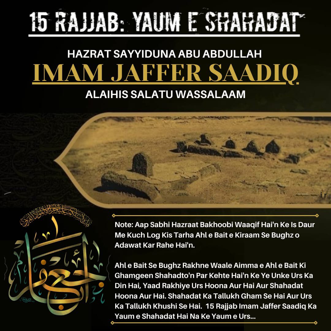*Aapki Wiladat 17 Rabi ul Awwal 83 Hijri Mutabik 20 April 702 Esvi Ko Madina Pak, Saudia Arabia Me Hui, Aapki Shahadat 15 Rajab ul Murajjab 148 Hijri Mutabik 14 December 765 Esvi Baroz Juma Hui, Aap Aaimma e Ahle Baith Ke Chathe 6th Imaam Hain, Aap Imaam e Aali Maqaam Hazrat Syedna Mola Imaam Hussain (Alaihis Salam) Ke Parpote Hazrat Syedna Mola Imaam Zainul Aabedin (Alaihis Salam) Ke Pote Hazrat Syedna Mola Imaam Muhammad Baqar (Alaihis Salam) Ke Sahabzade Hain, Aap Hadees, Tafseer Fiqh (Islamic Jurisprudence), Falsafa (Philosophy), Ilm e Kalaam (Theology), Ilm e Riyaazi (Mathematics), Ilm e Hai’at wa Falaq (Astronomy), Ilm e Tashreeh (Anatomy), Ilm e Keemiya (Alchemy) Aur Dusre Uloom Me Maahir The, Aapke Shagirdo Me Imaam e Aazam Abu Hanifa Hazrat Noman Bin Sabit (Razi Allahu Tala Anhu) Imaam Malik Bin Anas, Hazrat Sufiyan Sauri, Hazrat Jabir Ibn Hayyan Bhut Mashoor Hain, Aapka Mazar Mubarak Jannatul Baqi Sharif, Madina Pak, Saudia Arabia Me Marjai Khaliak Hain…*