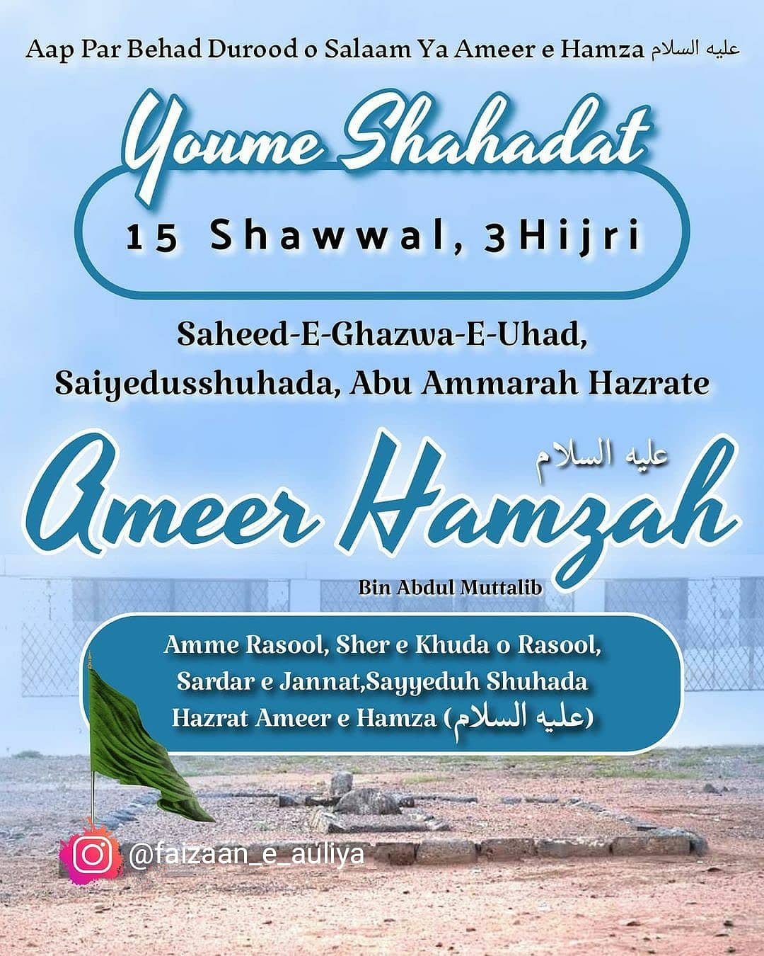 Koya’ni ‘Tamaam shohada ke sardaar’ aur ‘Rasool- Allāh ka Sher’. .Huzoor Rasool-Allāh (صلى الله عليه وآله وسلم) har saal Shohada e Uhad ki mazaar par tashreef le jaate aur waha farmate ‘Tum par salaam ho kyun ki tum ne sabr kiya. Tumhara akhirat ka ghar kaisa achha hai.’